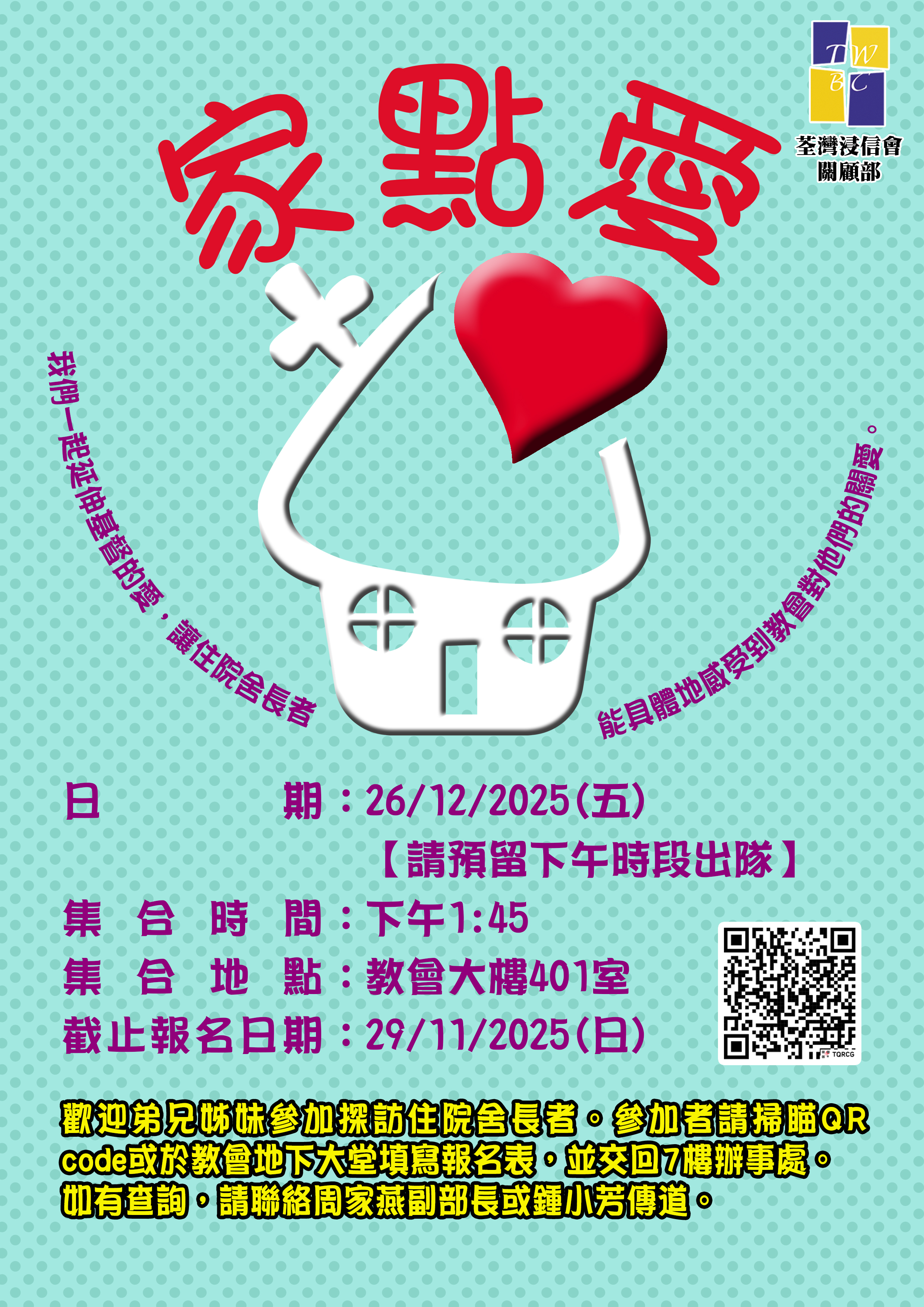 歡迎弟兄姊妹參加探訪住院舍長者(請預留下午時段出隊)。參加者請掃描QR code或於教會地下大堂填寫報名表,然後交回7樓辦公室。如有查詢,請聯絡周家燕副部長或鍾小芳傳道。(截止:29/11)