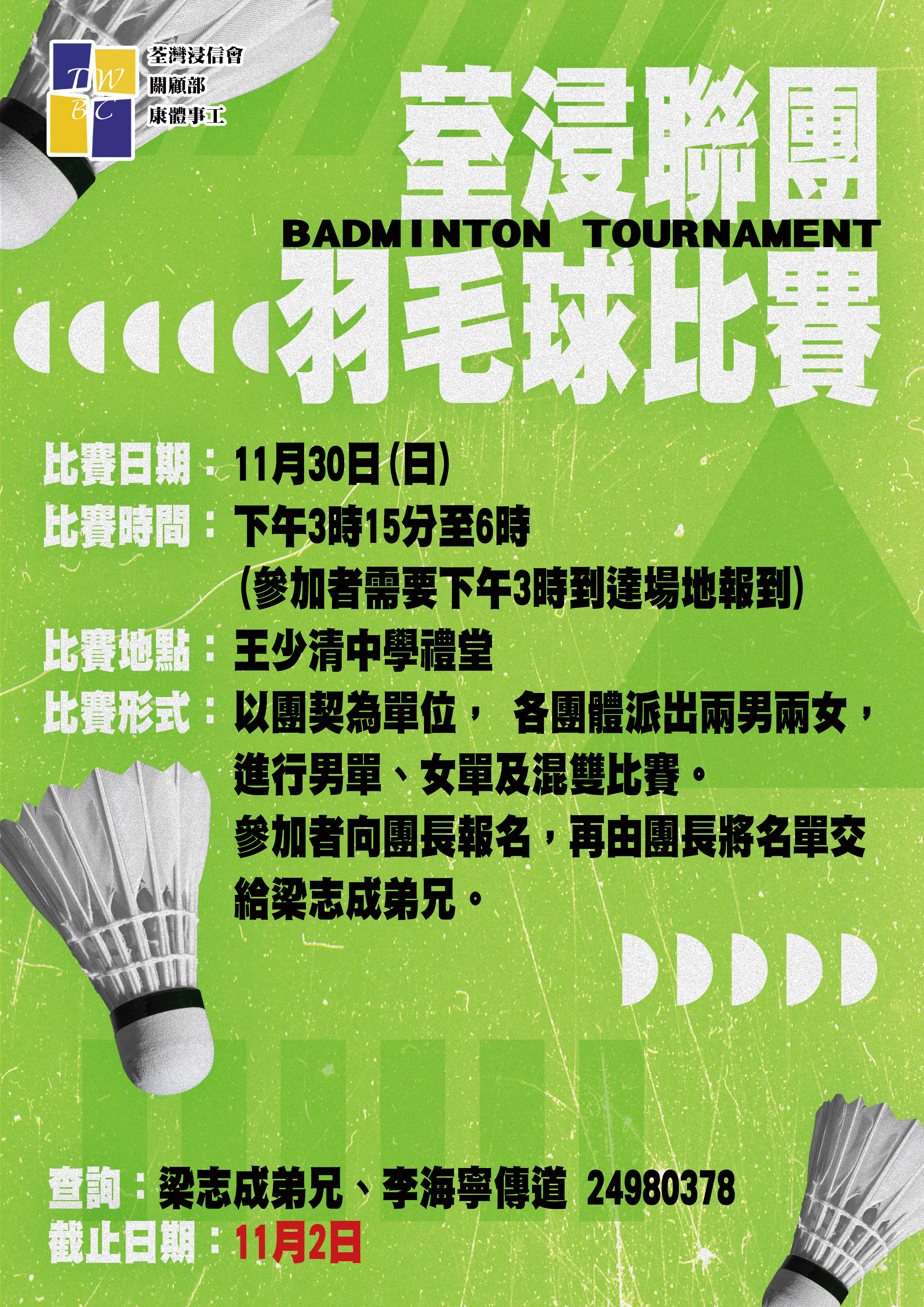 歡迎肢體於所屬團契向團長報名,比賽形式以團契單位進行,每個團契派出2男2女參加比賽(進行男單、女單、混雙比賽)。查詢請與朱清鏢弟兄、梁志成弟兄或李海寧傳道聯絡。(截止:2/11)