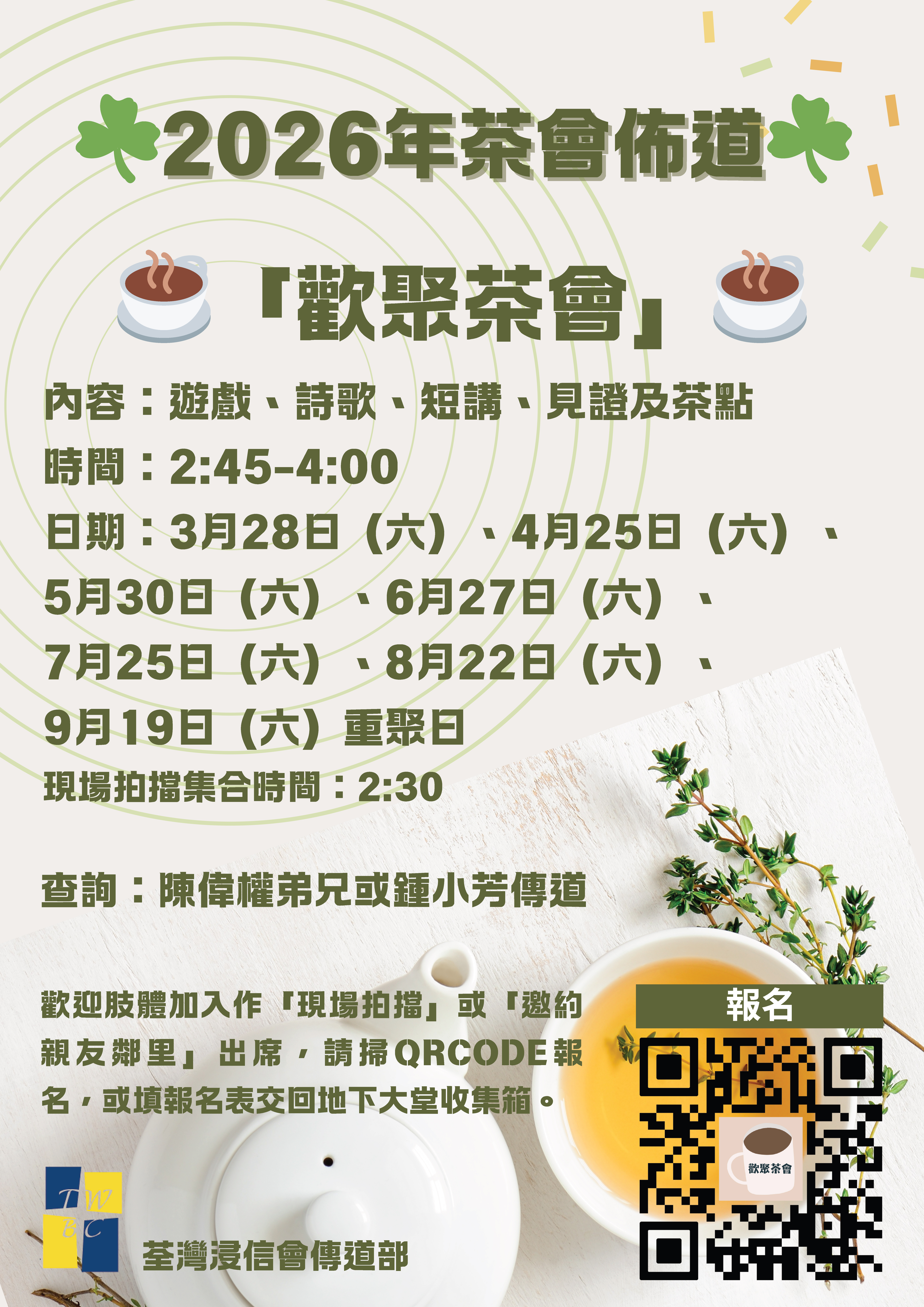 茶會內容以遊戲、詩歌、短講、見證及茶點的輕鬆形式進行,歡迎肢體參與3-8月每月一次「歡聚茶會」 作現場拍擋或邀約親友鄰里參加。報名請填妥QRcode,並投入地下大堂收集箱,查詢請與陳偉權副部長或鍾小芳傳道聯絡。