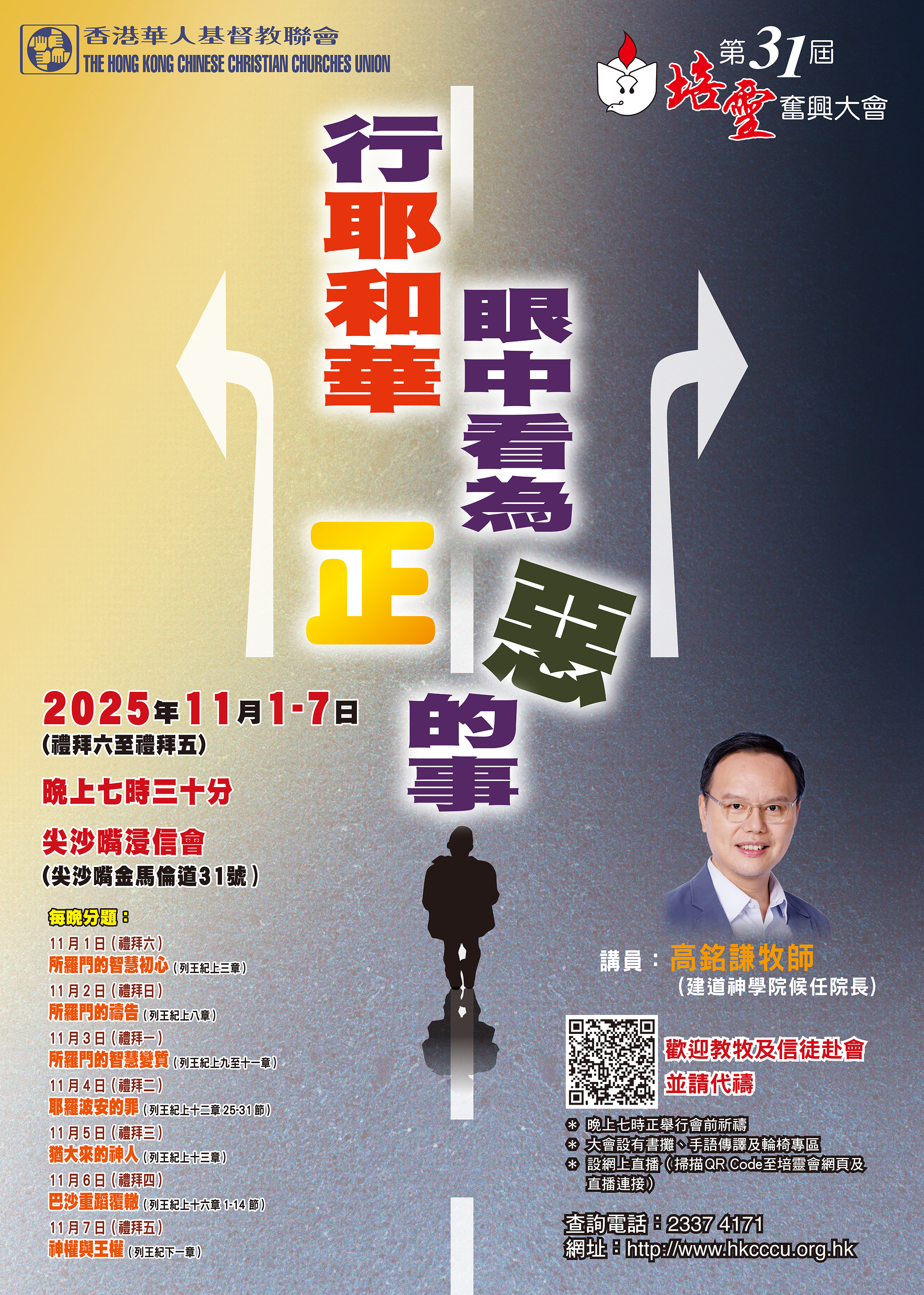 1-7/11晚上7:30假尖沙嘴浸信會舉行,由高銘謙牧師(建道神學院候任院長),主題為「行耶和華眼中看為正/惡的事」,歡迎肢體出席或可在聚會時間內瀏覽大會網站,